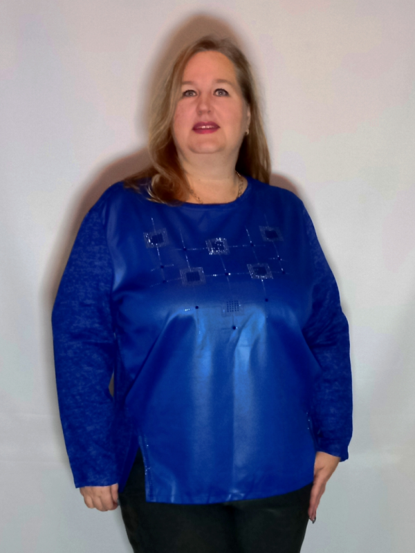 Тепленький и оригинальный блузон выполнен из сочетаний трикотажа по д кожу ( средней плотности, умерено эластичный, гладкий с наружи, внутри как обычный трикотаж) и ангоры меланж( мягонькая, эластичная, не рыхлая).