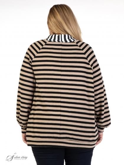 Джемпер прямого силуэта изготовлен из трикотажных полотен с рисунком в полоску разного цвета. Модель с длинным, объемным рукавом, покроя реглан. Понизу рукав присобран на круговую манжету из основного материала. Низ изделия обработан притачным поясом. Линия горловины оформлена мягким воротником типа «хомутик». Полочка декорирована термоаппликацией из миниатюрных страз. В модели учтены особенности фигуры дам нестандартных размеров. Блуза станет базовой вещью в Вашем гардеробе.