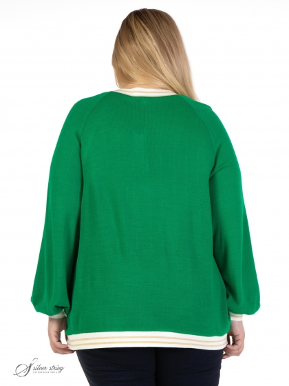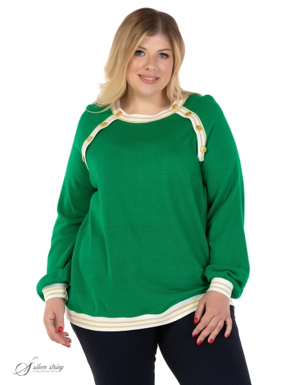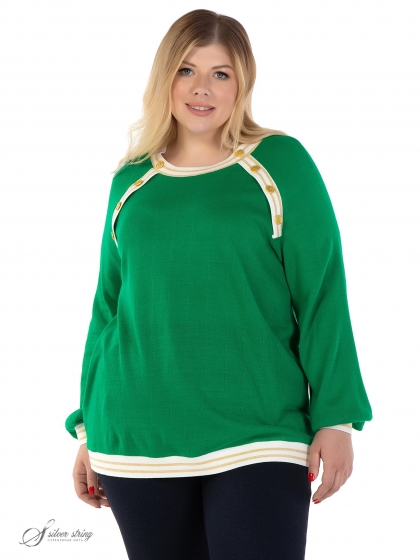 Модный джемпер прямого силуэта изготовлен из яркого фактурного трикотажного полотна. Модель с объемным, длинным рукавом, покроя реглан. Низ рукава присобран на притачную манжету из трикотажного подвяза контрастного цвета с золотистой полосой. Аналогичный подвяз расположен по низу изделия, горловине, а так же вдоль линии реглана полочки. Трикотажные планки по линии реглана дополнительно декорированы металлизированными пуговицами золотистого цвета. Секрет модели заключается в идеальных лекалах и интересных деталях, которые не оставят вас равнодушными.