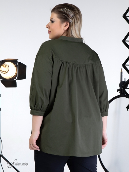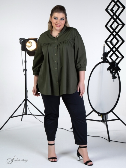 Блуза трапециевидного силуэта с воротником – стойкой и застежкой на кнопки. Модель выполнена из эластичной ткани с высоким содержанием хлопка. Особого внимания заслуживает отличное качество ткани. Переплетение нитей в полотне, придает материалу шелковистость и легкий блеск. По полочке и спинке проходит отрезная кокетка, переходящая на окат рукава. От линии кокетки, по центру спинки и на полочке, заложена легкая сборка. Рукав, длиной 3/4, обработан манжетой. Объем манжеты можно регулировать за счет парных кнопок. Это оригинальная модель, которая прекрасно впишется в Ваш гардероб и подарит настроение и комфорт.