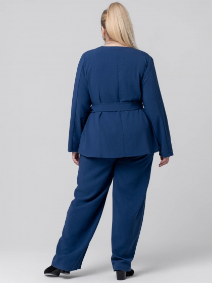 Эффектная блузка прямого силуэта выполнена из гладкокрашеной ткани с высоким содержанием натурального волокна. Модель с V-образным вырезом горловины, переходящим в «запах». На уровне талии закреплены части широкого пояса, которым фиксируется блуза на фигуре. Рукав длинный, прямого кроя, что позволяет носить его «на отворот». Модель прекрасно комплектуется с широкими брюками. Такой костюм выглядит очень элегантным и выгодно подчеркнет женский силуэт. Секрет заключается в идеальных лекалах и интересных деталях, которые не оставят Вас равнодушными.
