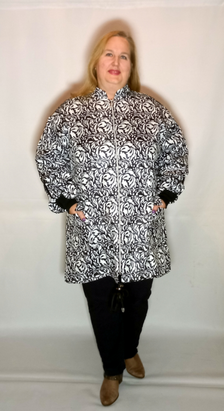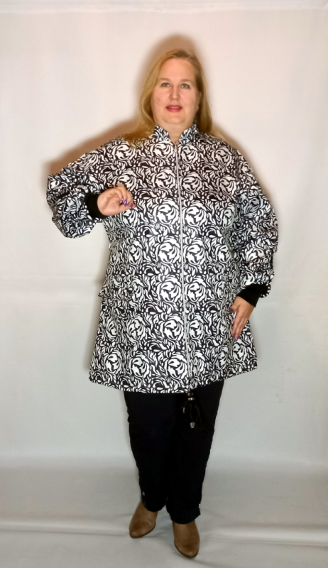Модный плащ-пыльник выполнен из водоотталкивающей, гладкой с лицевой стороны, плащевой ткани  с интересным принтом.  Для отделки использовали эластичную тесьму с надписями.
