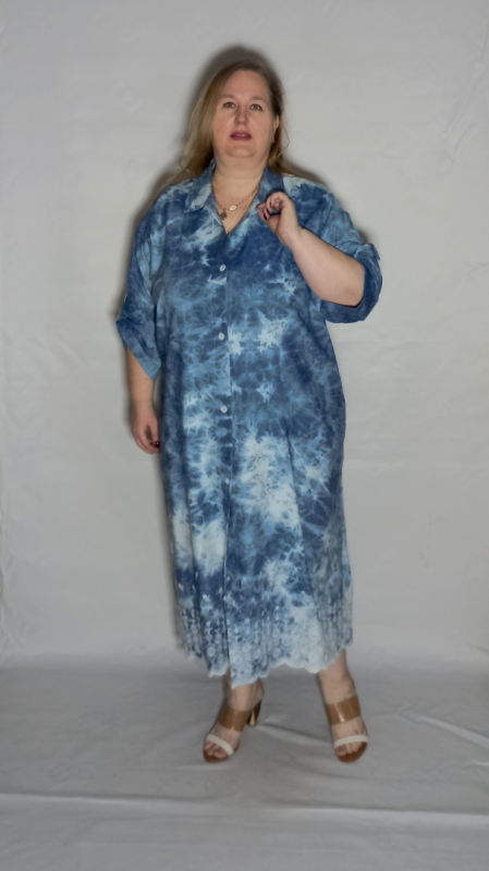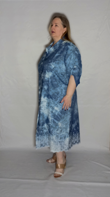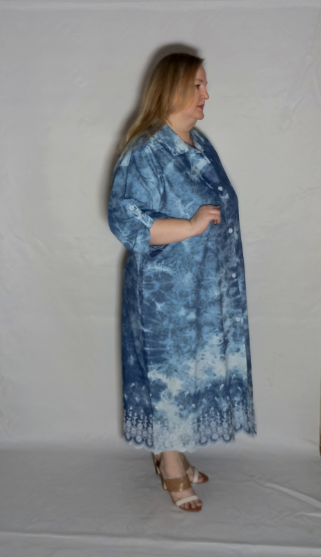 Шикарное платье из облегченной, рубашечной джинсы с эффектом "варенки" и вышивкой по низу платья и рукавов.