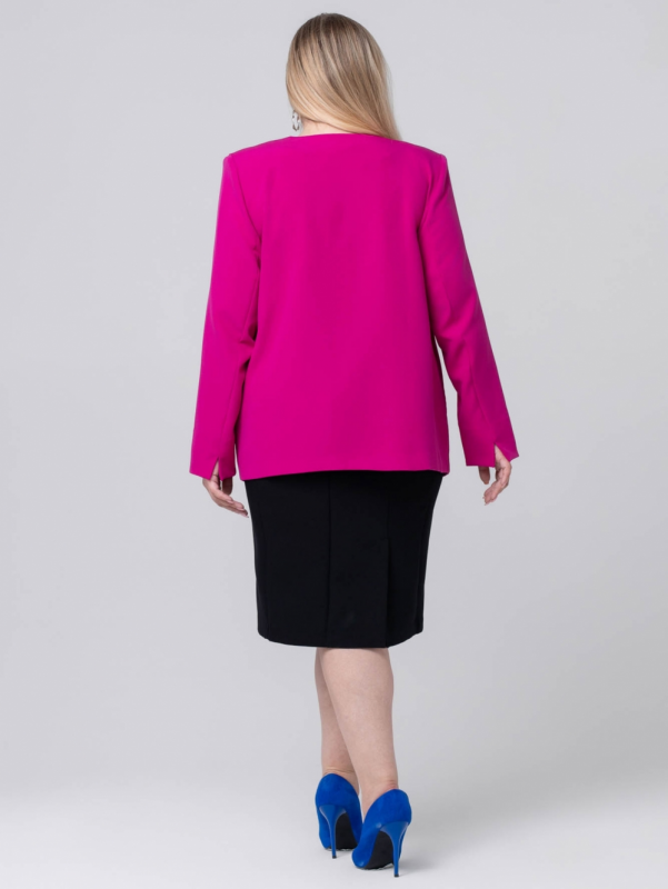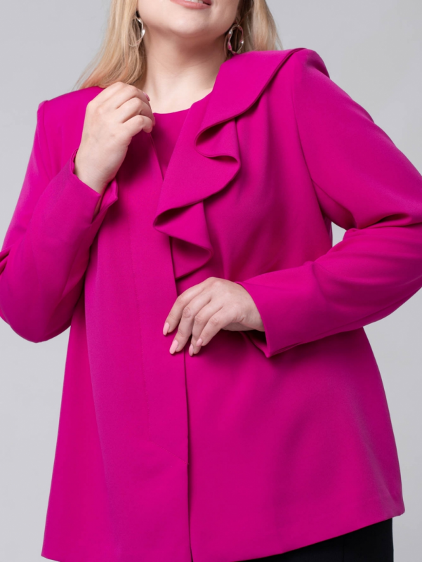 Нарядный жакет прямого силуэта выполнен из яркой смесовой ткани. Модель с округлой линией горловины и длинным втачным рукавом. В локтевом шве обработан разрез, позволяющий легко добиться нужной длины рукава. От левого плеча к центру спускается эффектная драпированная деталь, которая обладает волшебной способностью придавать образу утонченную женственность. По борту обработана суппатная застежка на пуговицы. Эту элегантную модель Вам будет несложно вписать в гардероб, ведь яркий цвет изделия поможет выглядеть современно, динамично и стильно.