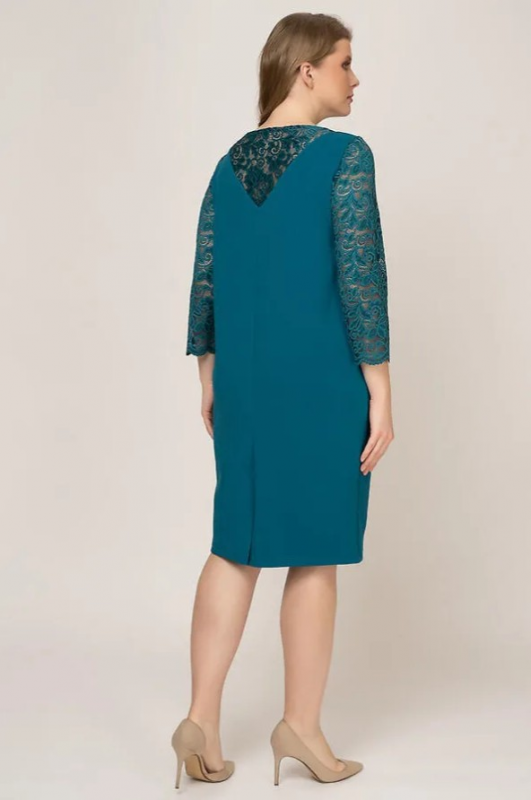 Эффектное платье, выполненное в комбинации плотного трикотажа и ажурного гипюра. Модель длиной до колен, чуть заужена книзу. С круглым вырезом горловины. Крой и игра фактур имитируют кружевное болеро с втачным рукавом 3/4.